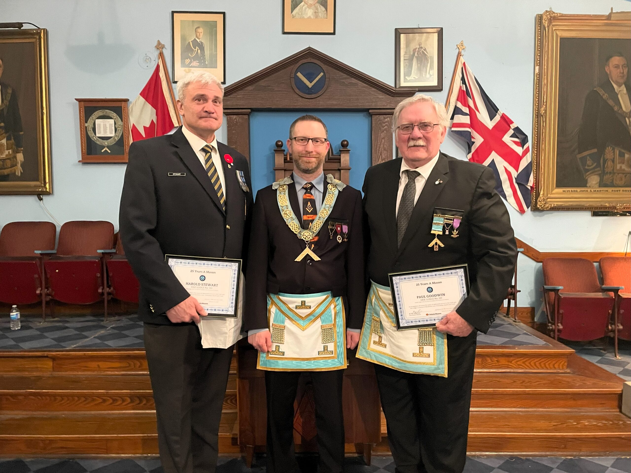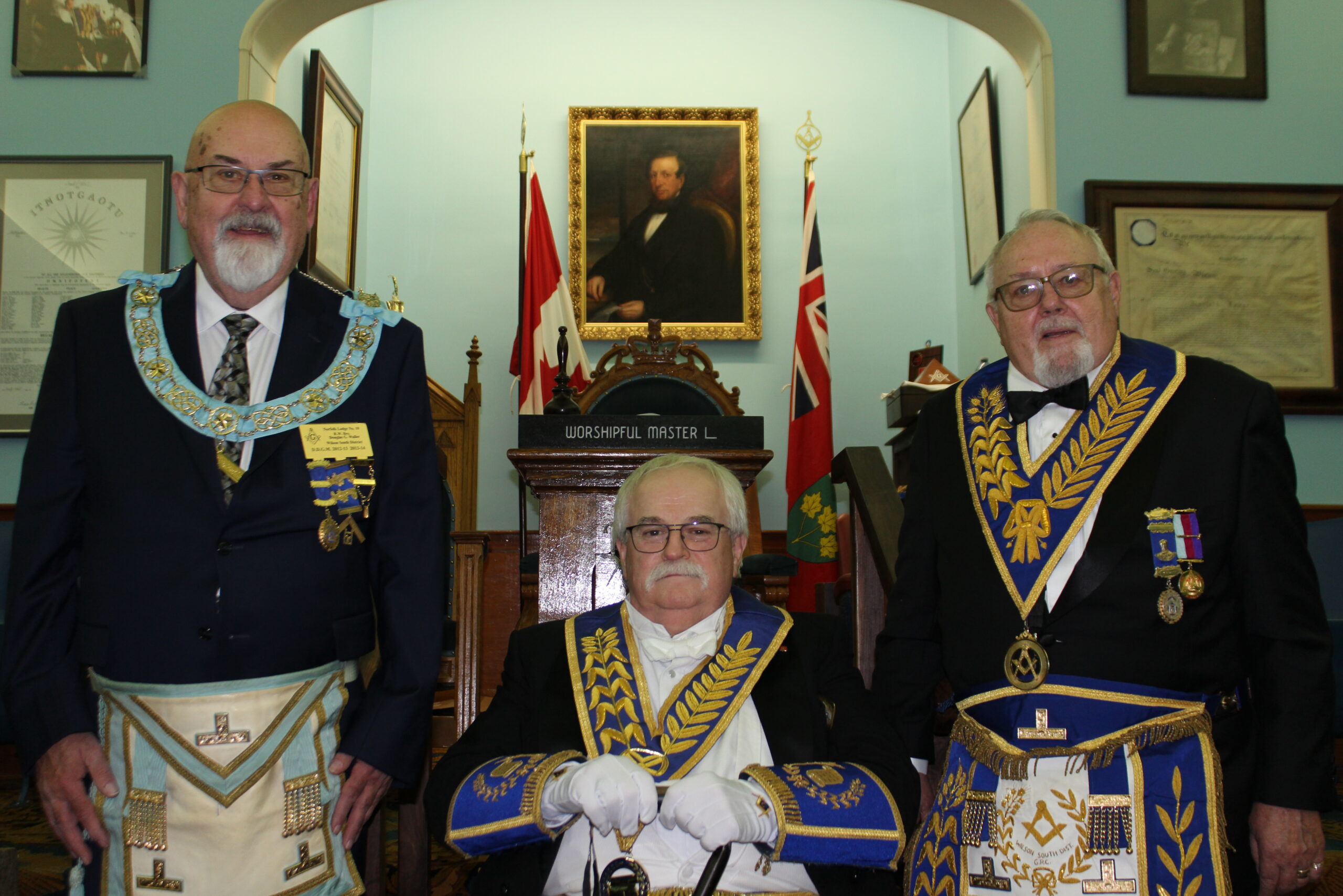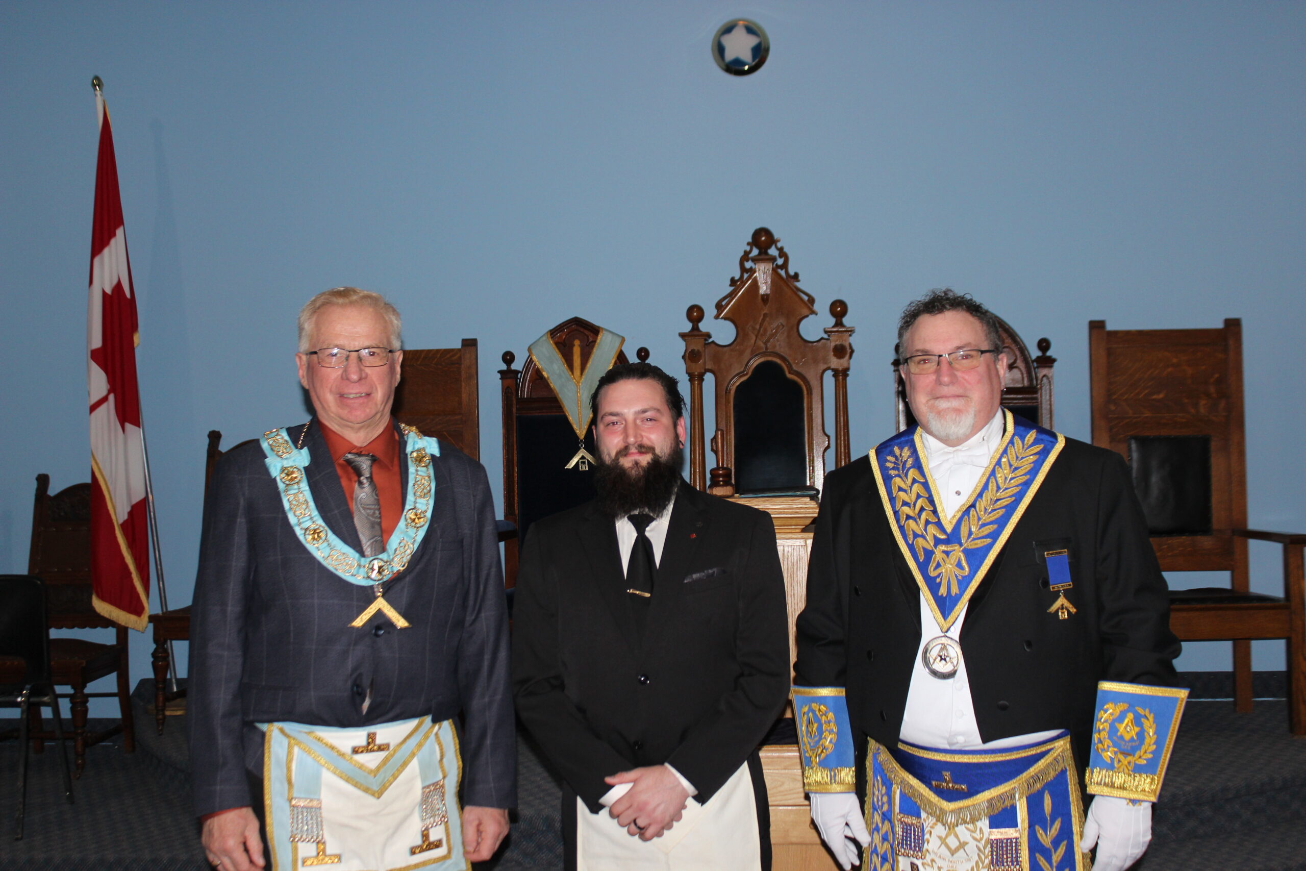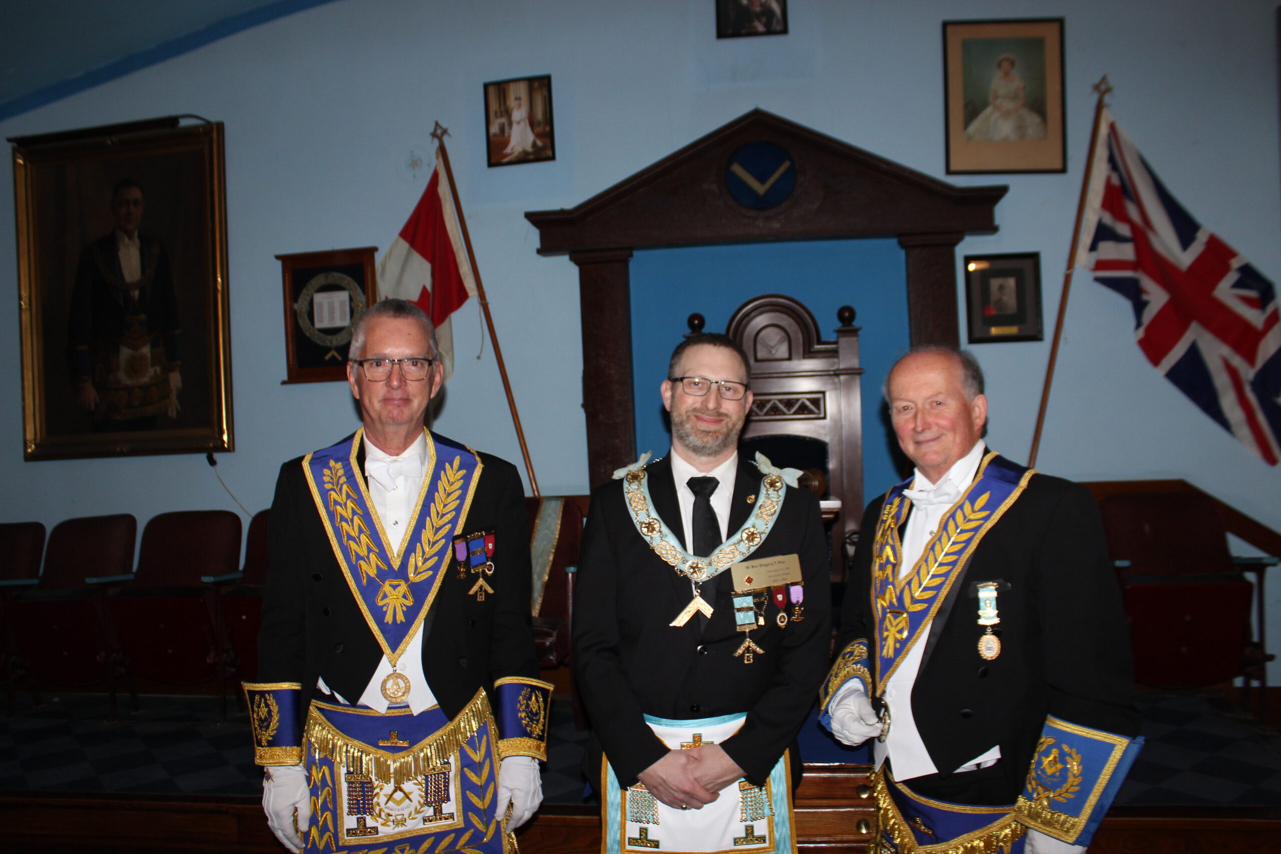 l-r: R.W. Bro. Joe Lewis Master - Bro. Frank MacMaster M.M. -R.W. Bro. Scott Gillies D.D.G.M. - September 23, 2025