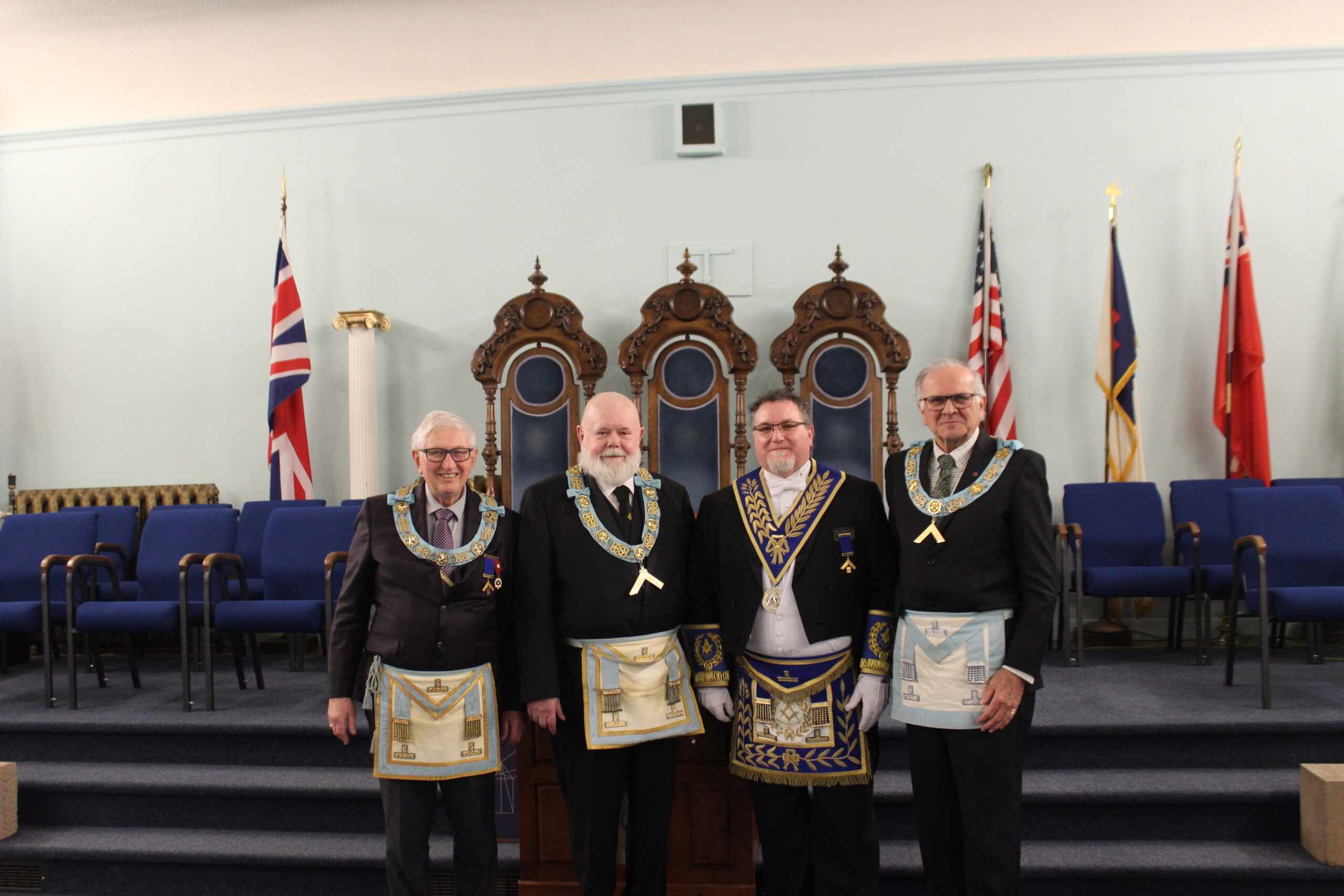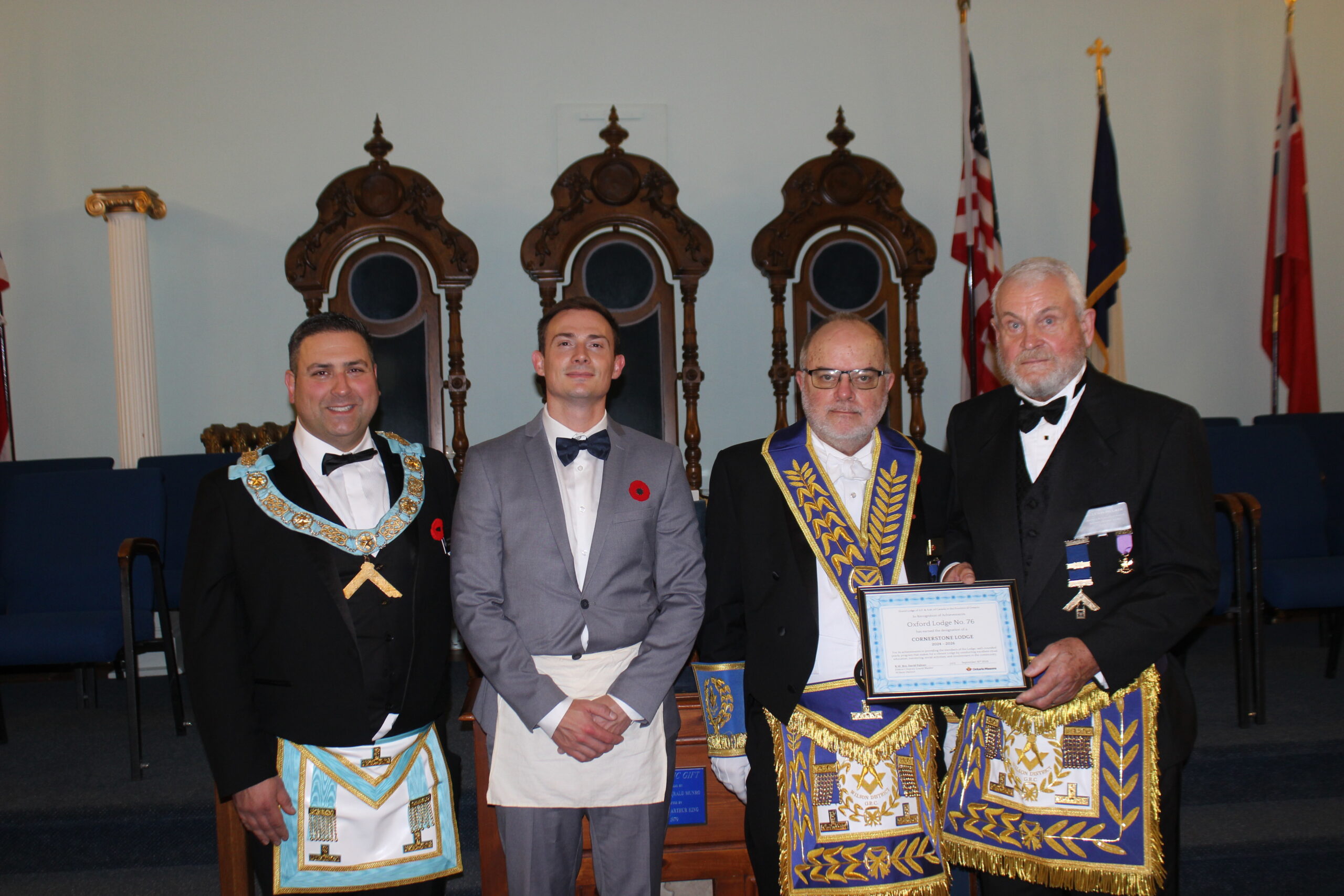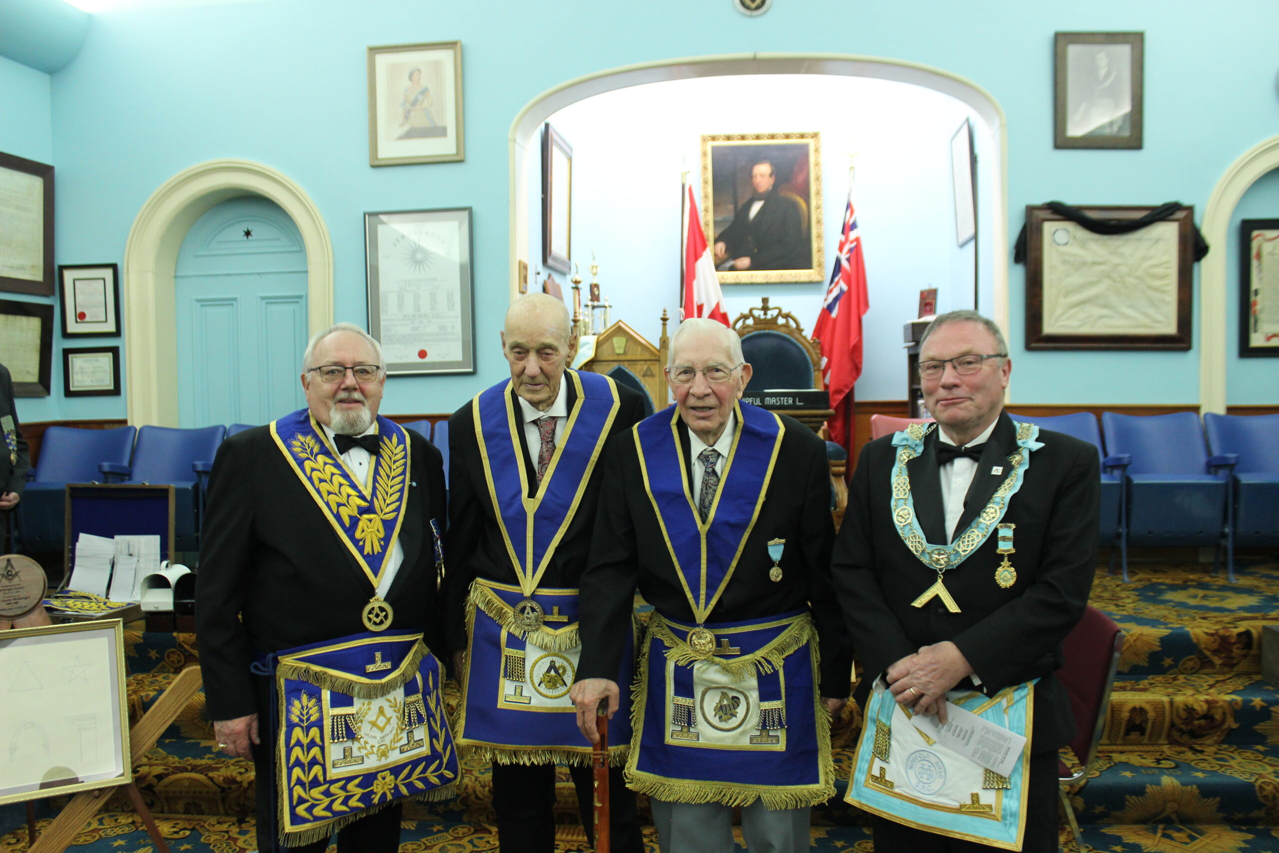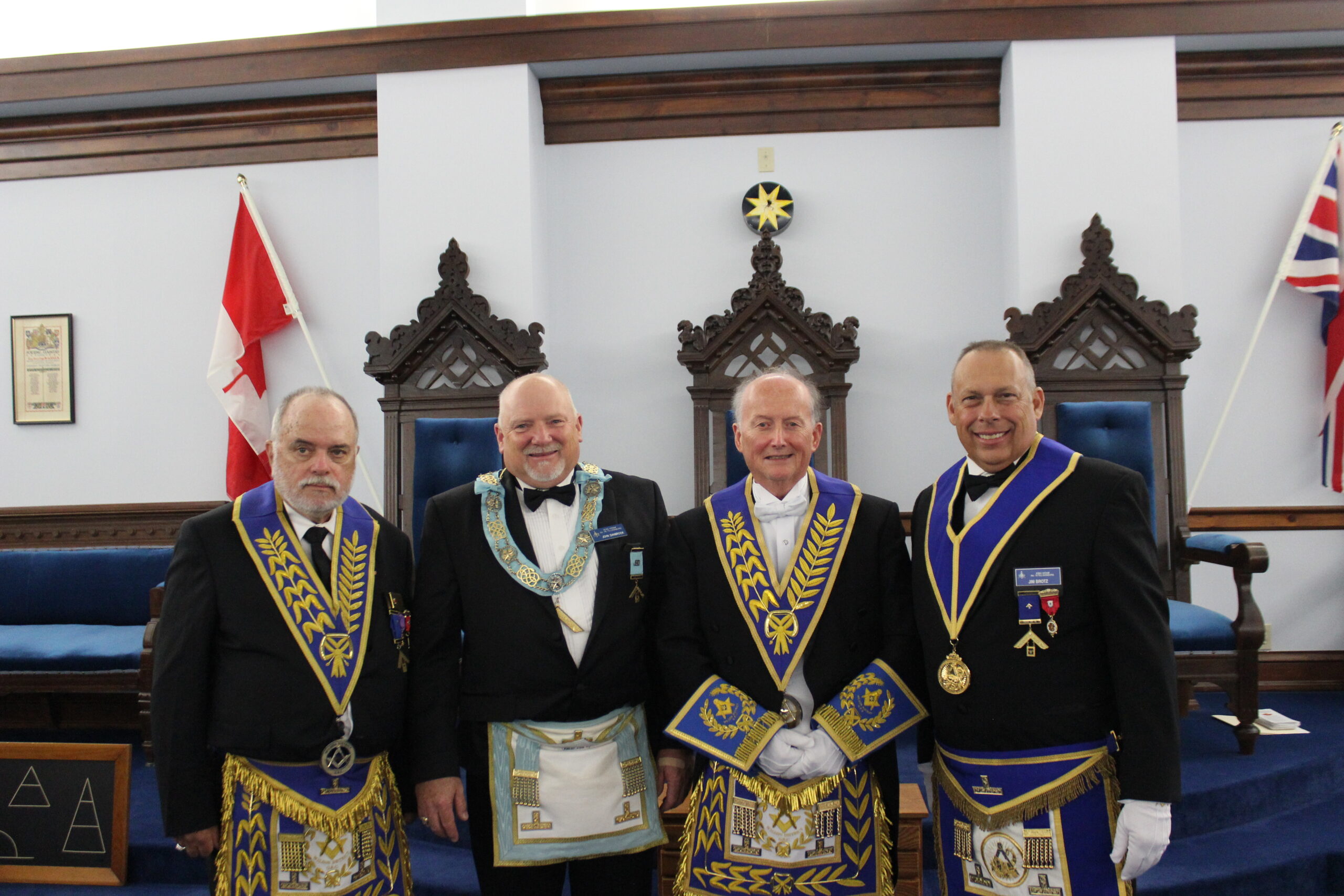 O.V. & E.A. DEGREE -NOV 10, 2025 L-R: R.W. Bro. Ian Sprague (London West)-W.Bro Eric Manuel- Bro. Paul Beraskin-R.W. Bro. Scott Gillies- R.W. Bro Dean Bauer (Brant District)