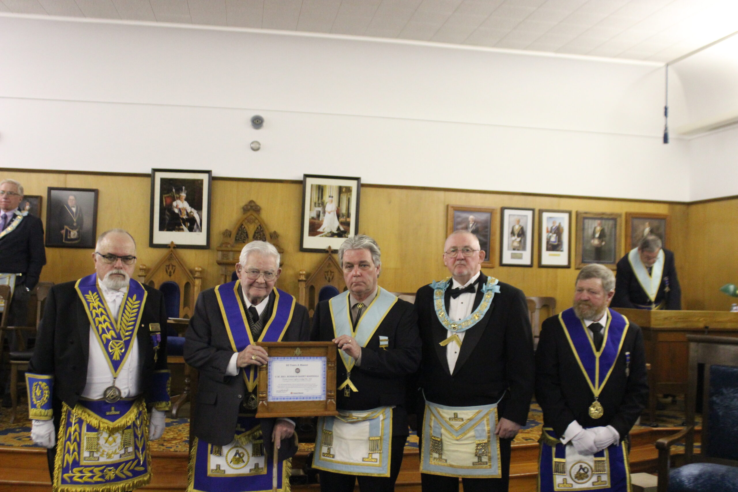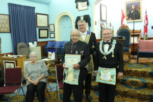 Presentation of 60 year pin: W.Bro Lawrence J. Hewson/Helen Hewson/R.W. Ian G. Chappell DDGM - Wilson District/W.Bro. Scott Jenereaux - Norfolk no 10