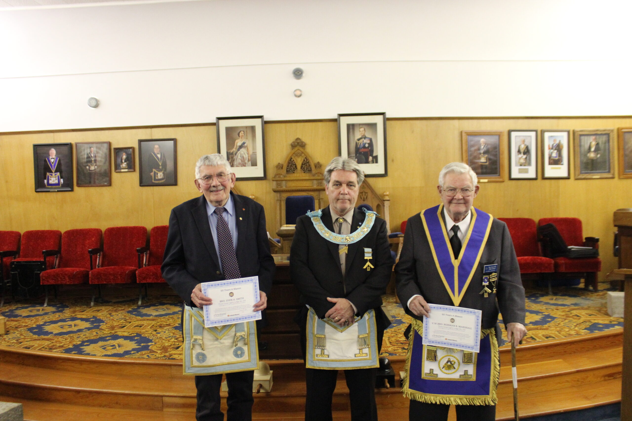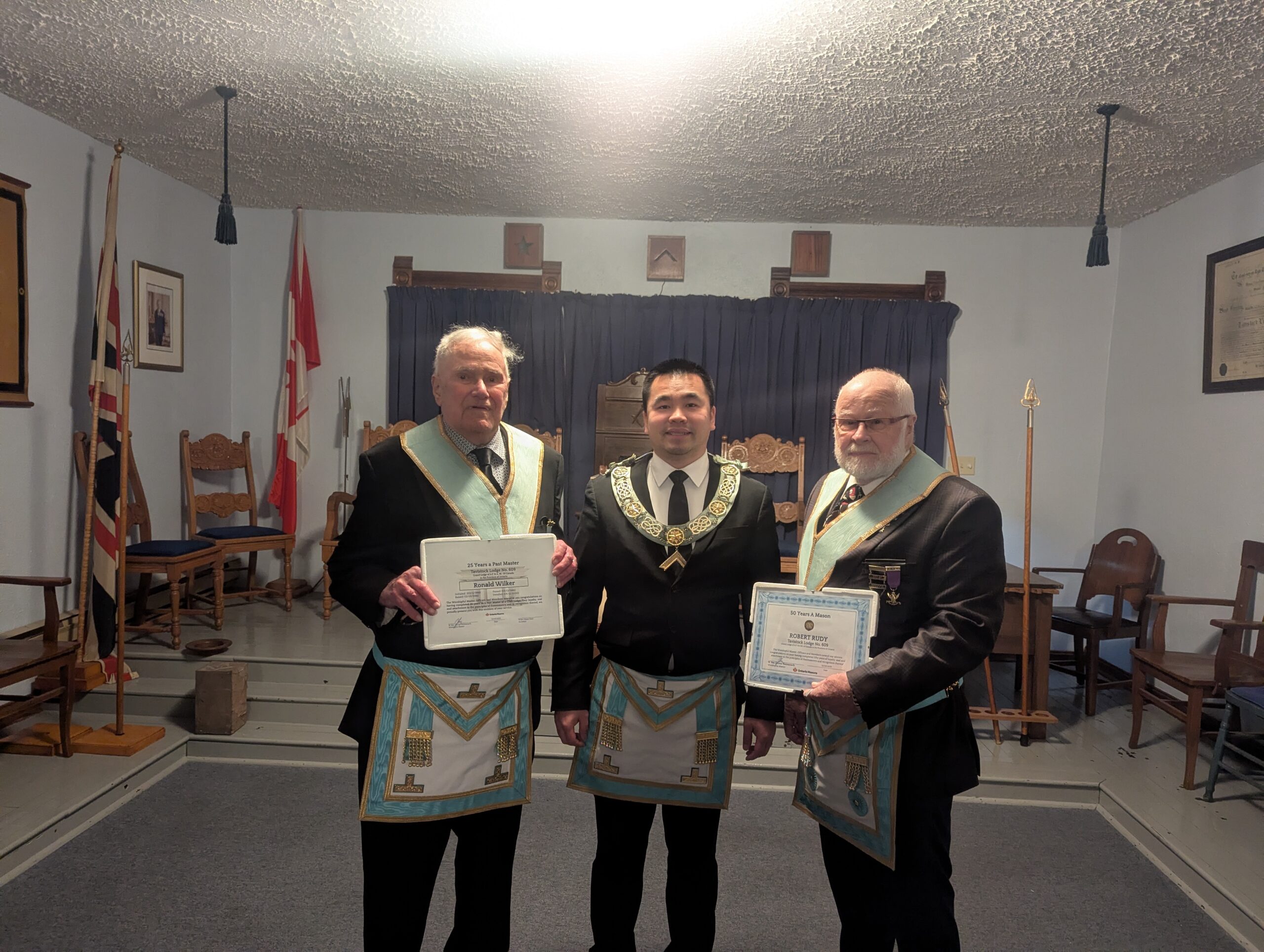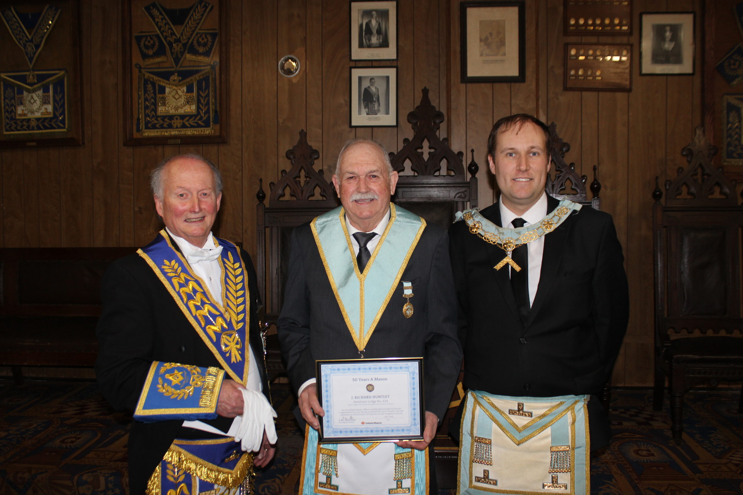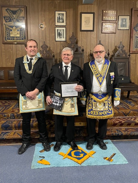 L-R: W.M. Dan Shaw - W. Bro. Ron Bradfield 50 year service award - R.w. Bro. David Palmer February 4, 2025