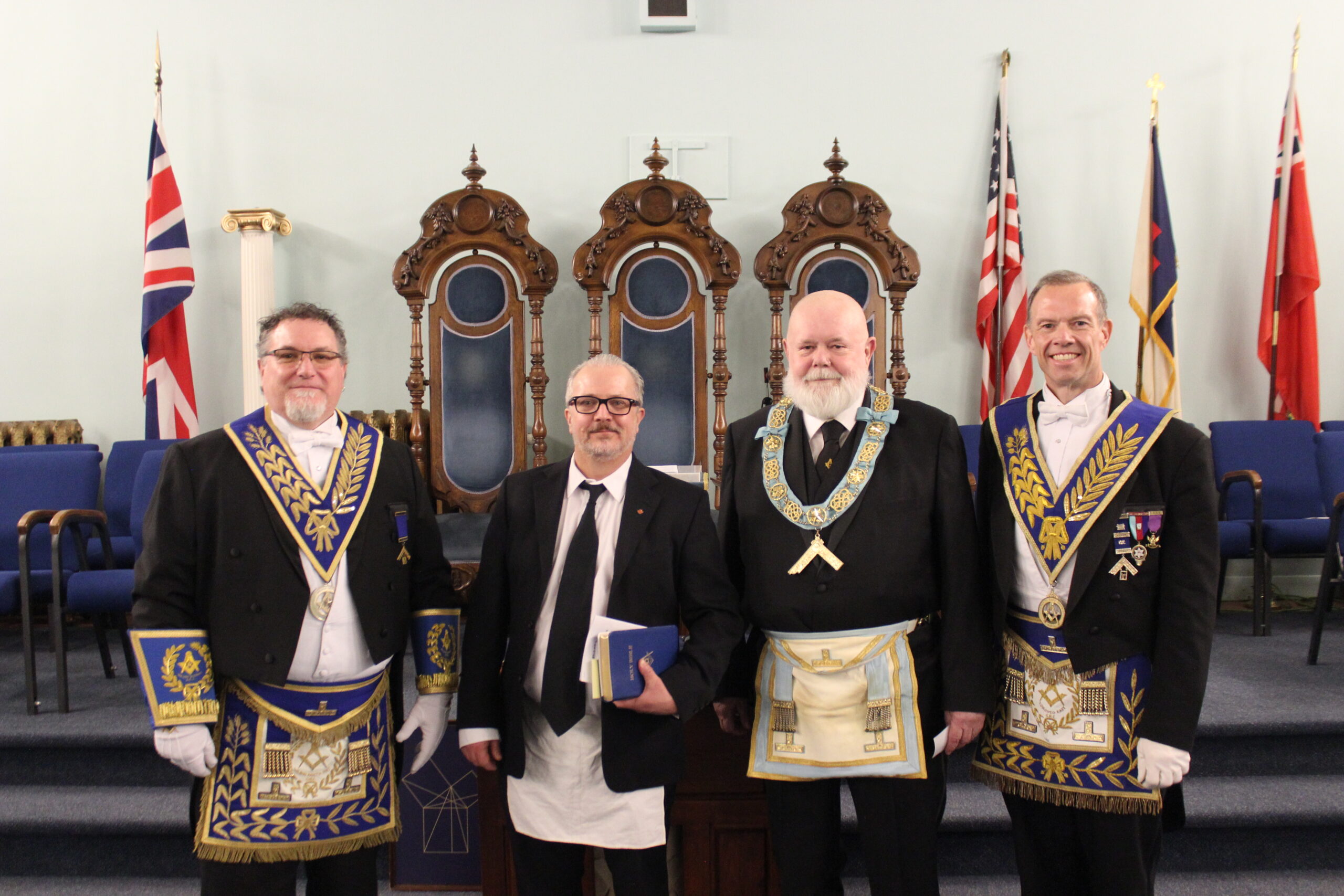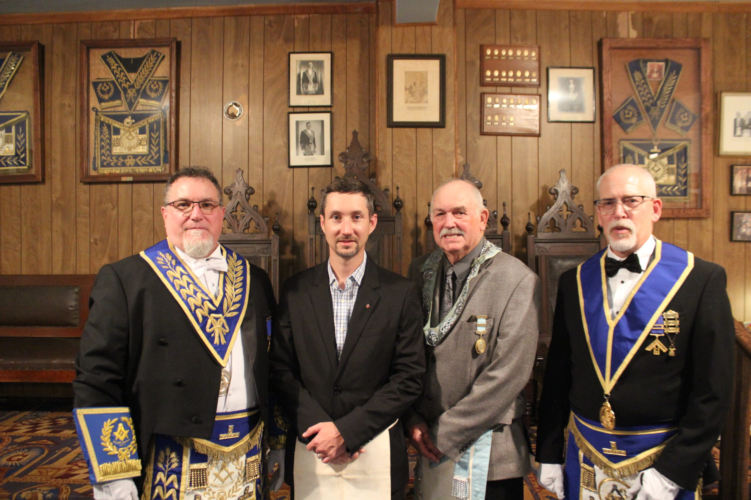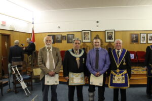 November 21, 2025 - l-r: W.M. John Danbrook (King Hiram 78) - Bro. Michael Harren - R.W. Scott Gillies D.D.G.M. - W.M. Scott Mitchell (Vienna 237)