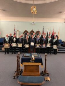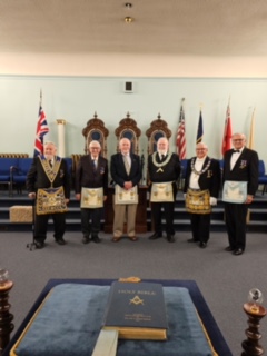 Installation - December 10, 2024 l-r: R.W. Bro. Joe Lewis I.M. - V.W. Bro. Howard Todd W.M. - R.W. bro. David Palmer D.D.G.M.