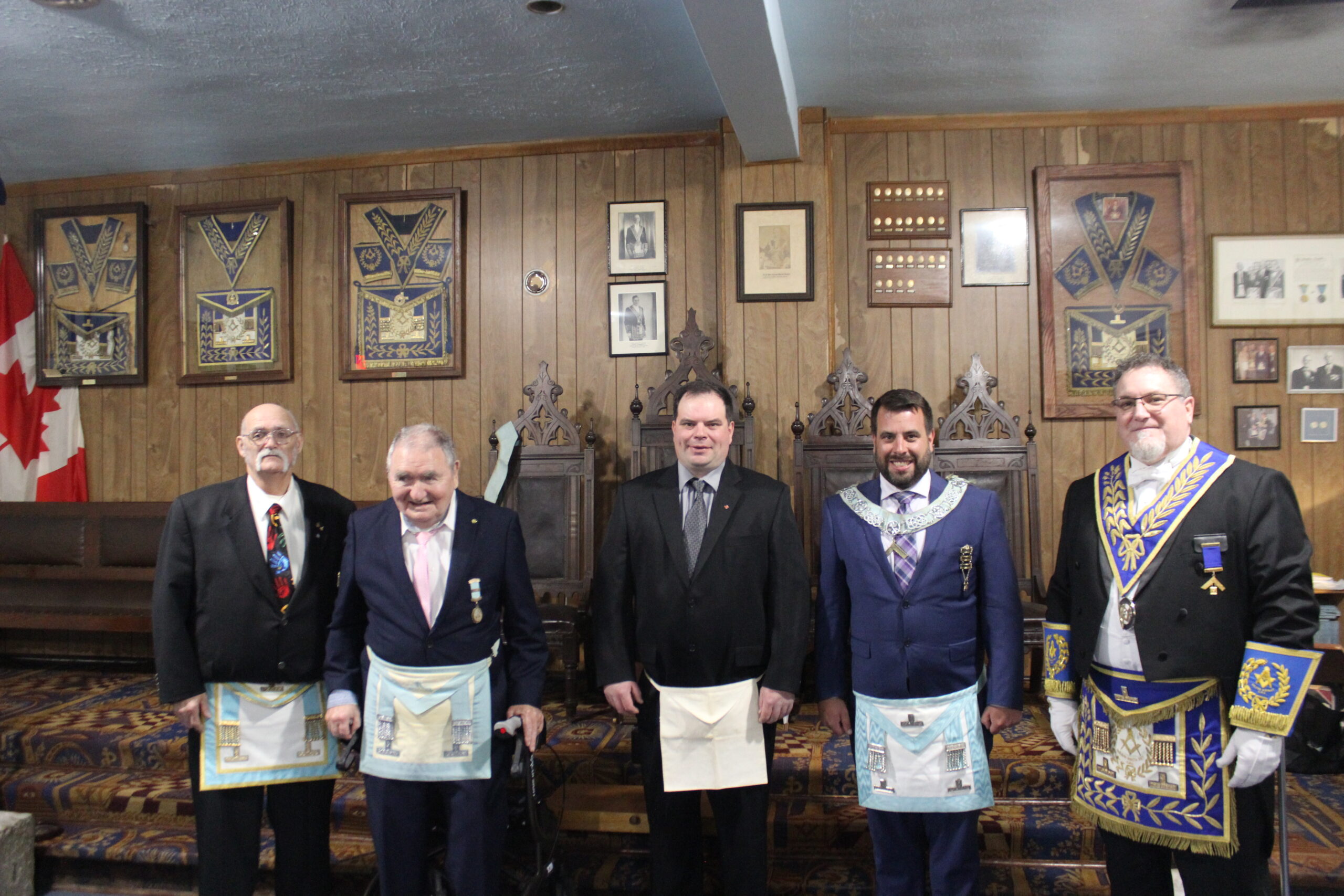l-r: W.Bro. Keith Price -25 yr pin - W.Bro. Lloyd Irwin - 50 year pin -Bro. Travis Cuthbert- W.Bro. Scott Paton - R.W. bro. James Eldridge D.D.G.M.